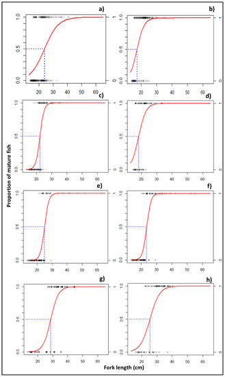 Length related to proportion mature for L. intermedius (a = female and b = male), L. tsanensis (c = female and d = male), L. platydorsus (e = female and f = male), and L. megastoma (g = female and h = male) during the breeding months (July to October) of 2016. Red lines are the fitted logistic regression; darker dots indicate that more individuals were plotted for that combination of maturity and fork length. The blue dotted line indicate the fitted size at the first maturity.