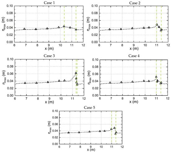 Calculated (dashed line) and experimental (triangle) maximum free surface, , along the vegetation patch. x denotes the longitudinal distance from the upstream edge of the vegetation patch, vertical green dashed lines denote the boundaries of the vegetation area.