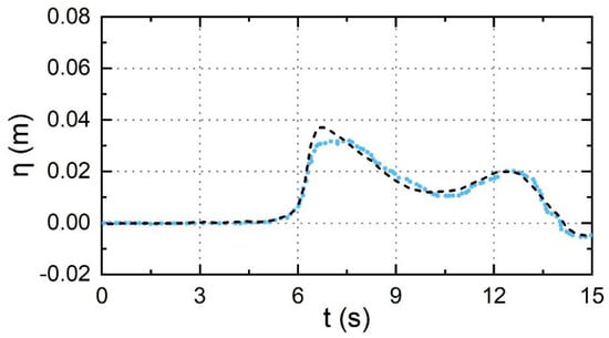 Free surface, time series at the end of the vegetation in case 3. Experiment data (blue dots) and numerical results (black dash line)