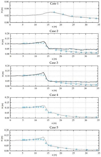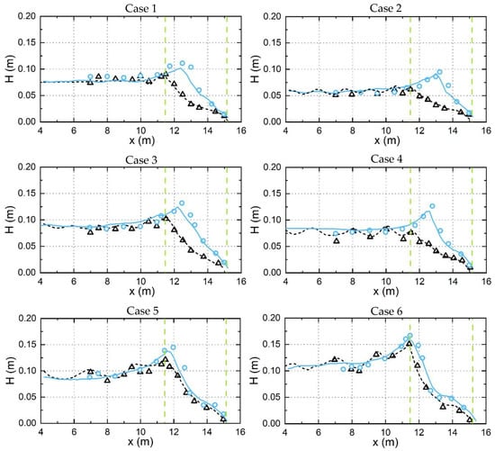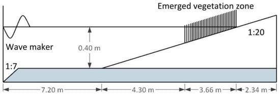 The experiments conducted at USDA-ARS National Sedimentation Laboratory in Oxford, Mississippi, USA by Wu et al. [36] were used to test the model against non-breaking and breaking wave interaction with vegetation over the slope as shown in Figure 4. The slope was m = 1:20. The vegetation was placed on the slope and was modeled by 0.2 m tall birch dowels with diameter of 3.2 mm in a staggered arrangement. The vegetation density was 3182 unit/m2 and the width of the vegetation was 3.7 m. The water depth was 0.4 m at the flatbed. The drag coefficient was calibrated as the bulk constant of 1.7 by comparing the wave heights, , of the measured data and the numerical results. According to Reeve et al. [34], the second-order Stokes wave theory was chosen here for wave generation. The experimental conditions used by the present model are given in Table 2.