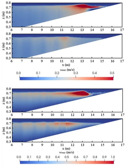 Figure 6 shows the maximum horizontal and vertical velocity fields in case 2. One is without vegetation and the other is with the emerged vegetation. A strong maximum horizontal velocity is observed near the shoreline if no vegetation is on the slope. With the enhanced resistance within the vegetation, the maximum horizontal velocity is noticeably reduced, compared to the unvegetated condition. In a similar way, the maximum vertical velocity is also much smaller near the shoreline. The velocity magnitude and its vertical distribution are important in relation to the coastal morphodynamics because the maximum velocity relates to the threshold motion of the sediment transport.
