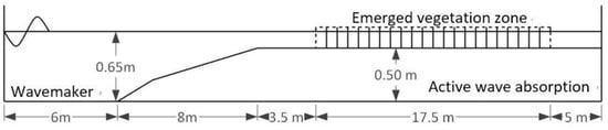 For laboratory experiments, most of them are using artificial vegetation, including rigid stems and flexible strips to mimic the real vegetation. Dalrymple et al. [5] considered the vegetation as the vertical cylinders of small diameter. The wave energy loss attributed to the fluid motion was estimated. Arnaud et al. [11] showed that there exists an oscillating behavior of the reflection coefficient in the direction of wave propagation. As the wave period increases, the oscillation decreases. On the other hand, the flexibility of the vegetation also has a strong influence on wave behavior. In general, greater flexibility results in more vegetation deformation under fluid motion and limits wave dissipation [12,13]. Luca et al. [14] carried out experiments for dense meadow, where the flexibility of the blade became a dominant factor. They concluded that the flexibility has considerably weakened the wave attenuation attributable to the vegetation in the meadow. Mendez et al. [6] conducted experiments on vegetation fields over varying bathymetry. A wave damping formulation for slope bottom conditions and breaking waves was presented. Maza et al. [15] also studied the hydrodynamics of the emerged vegetation for solitary waves. It was concluded that the macroscopic approach was able to produce satisfactory results if proper drag coefficient was obtained. Strusinska-Correia et al. [16] studied the influence of vegetation parameterization on wave height evolution and the bore propagation processes together with the hydraulic vegetation resistance subjected to tsunami-like solitary waves and tsunami bores.