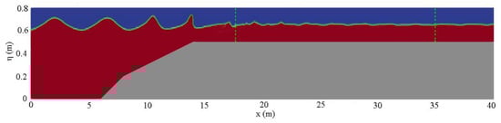 Figure 9 presents the snapshot of the free surface before waves start breaking as they approach the shoreline. The green dash lines show the location of the emerged vegetation. It can be found that the waveforms become asymmetric and the wave height increases due to wave shoaling effects on the slope.