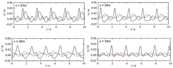 Free surface data without vegetation and with vegetation are compared to show the wave height attenuations over the vegetation zone. The vegetation density is N = 200 unit/m2, 400 unit/m2, and the wave period is 2.0 s. Wave gages are placed in the numerical wave tank at 20 m, 24 m, 30 m, and 34 m. The results are shown in Figure 10. Breaking waves on the slope reform on the shallow flat and gradually evolve into bore-like waves with multiple crest. Since the bore propagation speed is related to bore height, larger bores propagate faster and overtake the smaller ones. The nonlinearity, the wave crest being sharp and the wave trough being flat can be seen clearly.