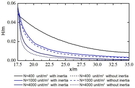 Figure 11 shows the calculated wave heights using both without and with the inertia force. When the vegetation is set as 400 unit/m2, the results are almost identical. However, when the vegetation is set as 4000 unit/m2, the difference arises as the inertia force reduces the wave damping induced by the vegetation. Therefore, the inertia force cannot be negligible when wave nonlinearity is high in the dense vegetation fields. It can be also seen that the wave height is decreased nonlinearly with the increase of the wave propagating distance, and nonlinearity is more obvious for the vegetation with a higher stem density. Most of the wave energy is damped by a span of the first 5 m in the vegetation. Figure 12 demonstrates that the snapshot of the velocity magnitude fields without vegetation and with vegetation, N = 400 unit/m2. Obviously, the existence of the vegetation does not affect the velocity distribution before the vegetation zone while the velocity reduces significantly inside it.