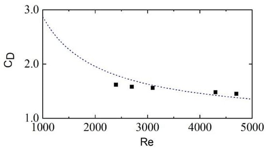 The determination of the drag coefficient remains the main issue that needs to be addressed. To the authors’ knowledge, the derivation of theoretical expressions for the drag coefficient does not exist. The common approach is to establish an empirical relationship between the drag coefficient and other dimensionless parameters, such as Reynold number () or Keulegan-Carpenter number (), by the experiments. Generally, the drag coefficient decreases when and increase. For experiments by Iimura et al. [8], however, no empirical formula can be found since few of them are particularly for the solitary waves. For experiments by Wu et al. [36], Tanino et al. [39] proposed a formula for the drag coefficient of emerged rigid cylinders to establish the relationship between the drag coefficients and . The validation of drag coefficients has already been done by Wu et al. [36] and will not be discussed here. This formula is valid in the range , which is not suitable for Phan et al. experiments (). For experiments by the Phan et al. [10], the empirical formula proposed by Maza et al. [24], as mentioned before, is used to fit calibrated drag coefficients in their experiments. The calibrated drag coefficients compared with the formulas are shown in Figure 13.
