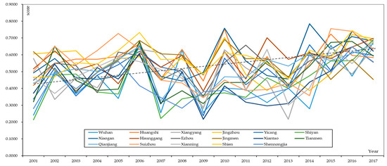 The above picture shows the changes in water resources carrying capacity in 17 regions of Hubei province from 2001 to 2017. Since the beginning of the century, the government and the public have shown concerns about water resources, although the overall situation has revealed a good trend. The overall score distribution in the scoring results gradually increased from 0.4 in the early 21st century to around 0.6 in more recent years. According to these data, the water resources carrying capacity is bound to move forward in a better direction, the main reason being index obstacle degree decrease (Figure 5).