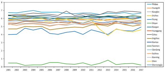 According to the above table, in addition to Xiantao and Tianmen regions that have not yet had their reservoir water storage data calculated, the reservoir water storage in most areas accounted for a considerable amount of water resources in the area, that can see in the Table 2, especially Shiyan city, because of the large amount of water storage in the reservoir, even more than the total amount of other water resources in addition to the reservoir storage. After the construction of a reservoir, this portion of water resources is expected to no longer participate in the same hydrological cycle system as before (for example, with evaporation increase, the surrounding air humidity is significantly higher) [20,21,22]. Taking Qianjiang as an example, according to statistical data, the reservoir water storage in 2016 accounted for 15.73% of the annual water storage in this region, and in 2017 this value was 24.50%. It can be seen that reservoir water storage has a great impact on the distribution of local water resources; when a large amount of water is stored in the reservoir, storing abundance and replenishing drought within the affected area is achieved, and local irrigation conditions, drinking water conditions, and water diversion to replenish the local ecosystem are all improved [23,24]. If the reservoir only exists as part of the regional water resources for ordinary analysis, this would greatly influence the water resources carrying capacity and therefore the objectivity of the results. Based on the above facts, this paper creatively puts forward reservoirs as a single indicator alongside the analysis of the water resources carrying capacity in the region, in order to achieve sustainable development in society, while accurately evaluating water resources, subsequently achieving a rise more in line with the actual guiding role.
