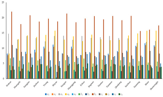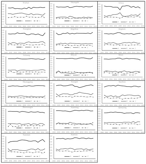 It can be clearly seen from the above figures that subsystem A is the greatest hindrance to the water resources carrying capacity of Hubei province as per the evaluation system selected in this paper, and is an important impact system when considering further improvement of water resources carrying capacity. The impact of B subsystem on water resources carrying capacity is also large, indicating that further improvement regarding water use efficiency is a very important measure that requires promotion. The low obstacle degree of sub-system C on water resource carrying capacity may be mainly caused by the low ecological water consumption in C and the low impact on the overall water consumption of sub-system C.