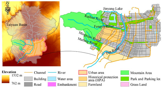 The study area is the south urban district of the city of Taiyuan, which lies in the Taiyuan Basin (Figure 1), with mean annual precipitation of about 456 mm. The south part of this area is about 241 km2 and has the lowest elevation, and the west of it is mountain area. The Fen River flows across the area, from the north to the south, and the Fengyu River (including the Kaihua River), Mingxian River, and Mafang River flow from the west to the east and converge together in the area [36]. The study area is experiencing urbanization. The whole area will become an urban area, about 65% of which may be covered by roads and modern buildings, by 2020 (Table 1). The whole study area could be taken as a completed drainage system, so we suppose that all the water that gets into or out of the area is conveyed by the rivers, channels, and pipelines [37]. As the biggest water body in the area, the Jinyang Lake could store 24 million m3 of water. The two small ponds located in the area could store 238 thousand m3 of water [37]. Both the lake and the ponds could be used to decrease the flood and be taken as the artificial sights in the area. Several big parks and parking lots are designed and assembled as contiguous green land to increase the rainfall infiltration and reduce the surface runoff.
