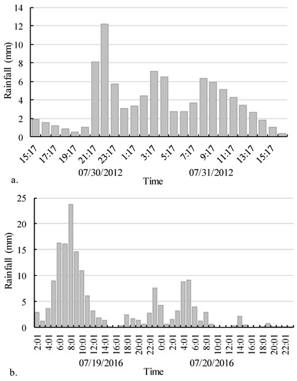 Rainfall series in (a) July 2012 and (b) July 2016.