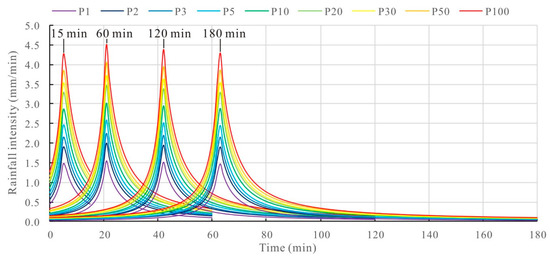 We chose the rainfall durations of 15, 60, 120, and 180 min of different return periods as examples, the design hyetographs are shown in Figure 3.