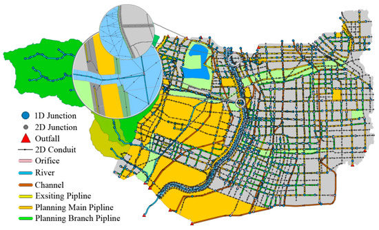 Channels and pipelines were modelled by 1D conduits. Surface runoff of broad roads and farmland were modelled by the 2D meshes connected by the 1D conduits (Figure 4). Wide rivers were modelled by both 1D conduits and 2D meshes. 1D conduits with irregular transects were used to model the river channel and 2D meshes were used to represent flooding. This method assumes that the water elevation in the 1D channel will not be accounted for by the 2D mesh until the water has hit the elevation of the bank station and flooding occurs [42]. The 1D conduits and 2D meshes were directly connected by orifices, which is represented as a link connecting two nodes. The flow in both the 1D conduits and the 2D meshes were calculated by 1D Saint-Venant equations.