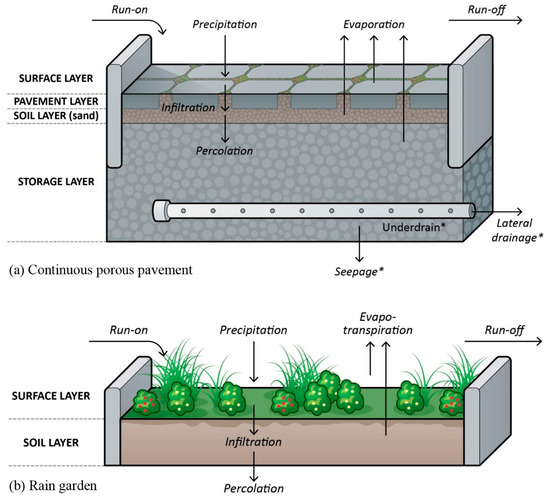 Continuous porous pavement systems (CPPs) are excavated areas filled with gravel and paved over with porous concrete or asphalt mix (Figure 5a) [44]. Normally all rainfall will immediately pass through the pavement into the gravel storage layer below, where it can infiltrate at natural rates into the site’s native soil. The technical specification for pavement of water permeable brick [45] gives the parameters of the continuous porous pavement (Table 5).