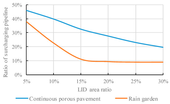 The LID area of the rain garden was evaluated. If the LID area is between 5% and 15%, the rain garden has good performance on reducing the surcharging pipelines. However, when the LID area ratio exceeds 15%, increasing LID area is not much help for reducing the surcharging pipelines (Figure 9).