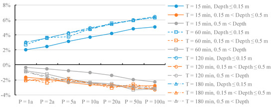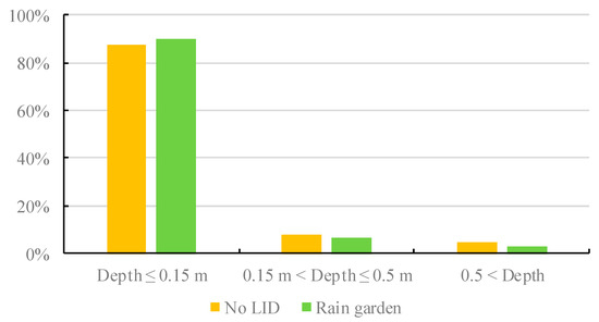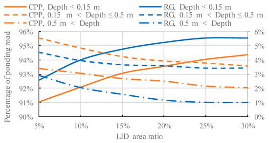 When the LID area increases, the non-ponding area increases, and the ponding area decreases (Figure 7). The rain garden performs more efficiently than the continuous porous pavement. Taking the storms of duration of 180 min and return period (P) of 10 years as an example, when the LID area ratio is 10%, the continuous porous pavement could reduce the ratio of the road area whereby the depth of ponding water in a place exceeds 0.5 m to 3%, and the rain garden could reduce it to 2%. If it needs to reduce the ratio to 2%, the LID area ratio of the rain garden is 10%, but the continuous porous pavement is 25%.