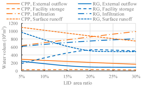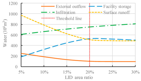 The external outflow, facility storage, infiltration, and surface runoff of different LID scenarios with different LID area ratios.