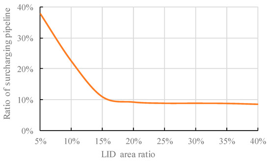 The ratio of surcharging pipeline of different LID scenarios with different LID area ratios.