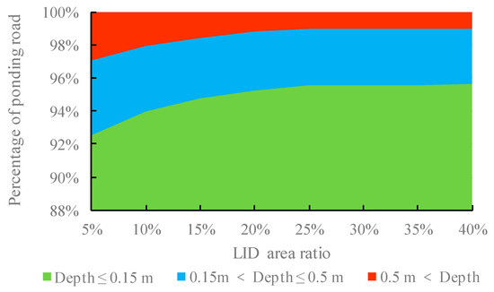 The percentage of ponding road of the rain garden with different LID area ratios.