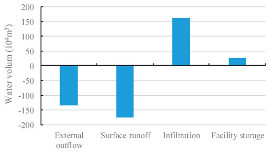 The external outflow is the sum of the water flowing out of the study area though the rivers, channels, and pipelines. The infiltration is calculated by the Horton’s equation. The surface runoff is modelled by the 2D meshes connected with pipelines, channels, and rivers, and flow out the study area through these conduits. The facility storage is composed of the storage of depression, lakes, and the LID.