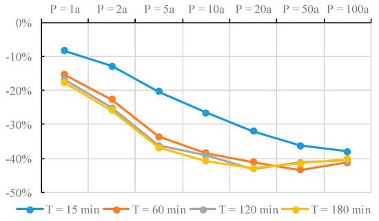 To estimate the efficiency of the pervious pavement and rain garden, we made the assumption that the building area only uses one kind of LID in each scenario. The model was run with the design storms of duration of 180 min and a return period (P) of 10 years. The rainfall duration and the return period were recommended in the special planning for the sponge city of Taiyuan [37]. The LID-occupied area increases from 5% to 30%. The indexes mentioned above are used to estimate the efficiency of the two kinds of LID.