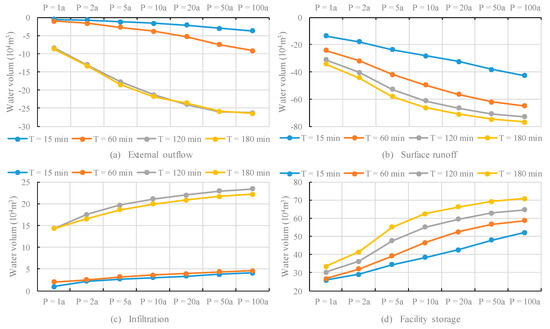 The variation of the external outflow, surface runoff, infiltration, and facility storage of the rain garden in different return periods.