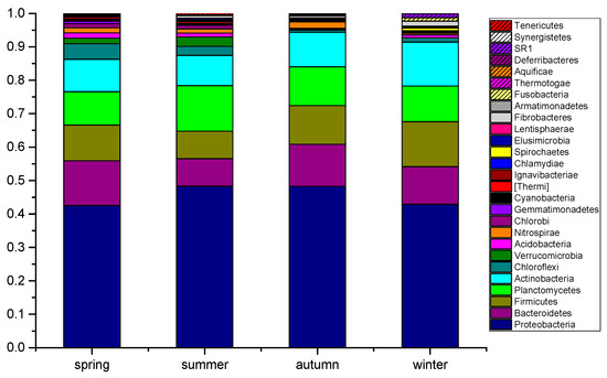 To compare the genotypic diversity, the community richness (Chao and Ace indexes) and community diversity (Shannon index) were calculated (Table 2). A greater Chao/ACE index indicates higher community richness, while higher Shannon index indicates higher community diversity. Table 2 shows that the wastewater final effluents sampled in summer and autumn had significantly higher bacterial diversity than the wastewater final effluents sampled in spring and winter, and the samples in autumn displayed the highest diversity, while the lowest bacterial diversity was found in samples collected in winter.