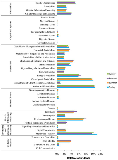 According to the relative abundances of the OTUs, functional profiling of microbial communities were predicted using 16S rRNA marker gene sequences [21], and the results are shown in Figure 2. These functional genes presented stable distributions with slight seasonal variations. They were mainly related to cellular processes, environmental information processing, genetic information processing, human diseases, metabolism, and organismal systems. Of these, the genes related to metabolism were the most dominant, with relative abundances of more or less than 50% in each season. In addition, genes related to human diseases had relative abundances of approximately 1% in each season, and the main diseases related to the annotated genes were infectious diseases, neurodegenerative diseases, cancers, metabolic diseases, immune system diseases, and cardiovascular diseases.