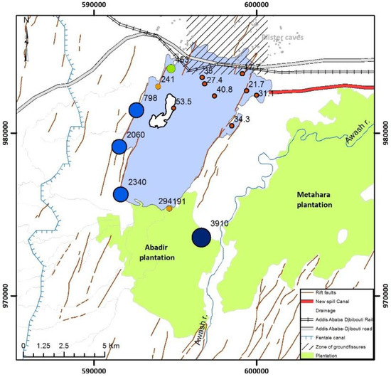 The conclusions made about the origin of water do not contradict the conclusion made by [7] in that the increase in discharge of springs in the western and south western sector of the lake is responsible to increase the lake water gain. However, the current work pinpoints the origin of the water to be from irrigation return water entering the geothermal reservoir and returning to the lake as the main source of water. While the mechanism was clearly supported with evidence, [7] left an open question about where the actual water that leads to the increase in the discharge of the spring comes from. The isotopic evidence in this work reveals the source of the actual water is irrigation return water following the subsurface flow path. Because of the shallow geothermal gradient related to the Fentale volcano [4], the shallow groundwaters can easily be heated, thereby imparting high temperature to the seepage waters leading to the temperature profile observed by [7].