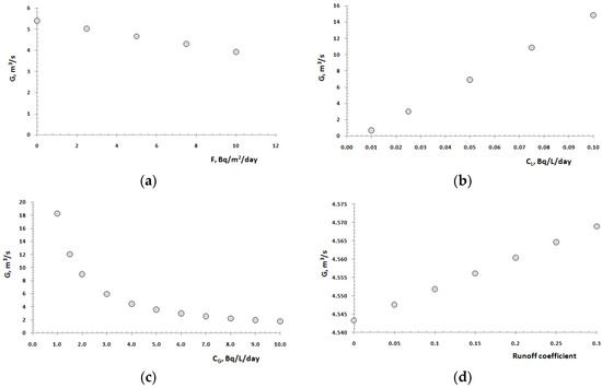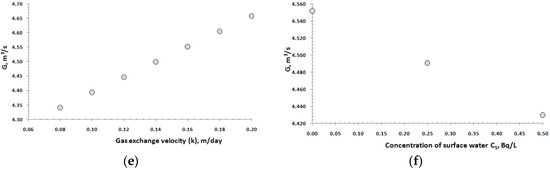 The inherent uncertainty in the model input parameters necessitates sensitivity analysis run so as to evaluate the validity of the results. Figure 6a–f shows sensitivity of the model output (groundwater inflow rate) to the various input parameters. The sensitivity was run on selected input parameters. The selection is based on the level of confidence on the value of the input parameters, i.e., parameters on which we made assumptions were chosen for sensitivity run and parameters for which exact measurement exist were not chosen (e.g., lake geometry parameter, area and volume were not chosen and the measured evaporation rate, precipitation rate). In the sensitivity test a parameter value was forced to vary by certain amount keeping all other values as in the model input value except for the one under consideration. The chosen variables were (a) the 222Rn concentration of the lake (), (b) the diffusive 222Rn flux (F), (c) the gas exchange velocity (), (d) the concentration of the groundwater end member () and (e) the surface water inflow rate which was estimated from runoff coefficient consideration (S) and its 222Rn concentration (CS)