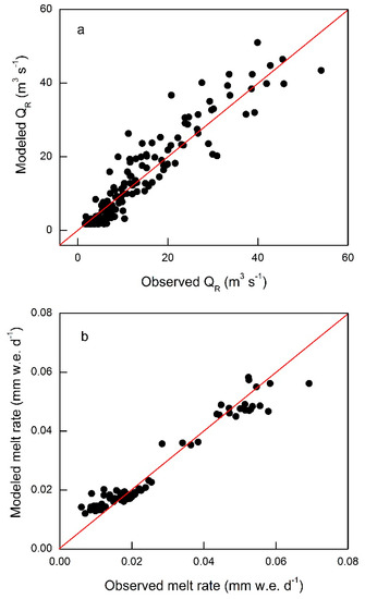 - Zhang, Y.; Liu, S.; Ding, Y. Glacier meltwater and runoff modelling, Keqicar Baqi glacier, southwestern Tien Shan, China. J. Glaciol. 2007, 53, 91–98. [Google Scholar] [CrossRef]