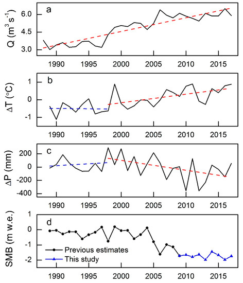 - Zhang, Y.; Hirabayashi, Y.; Liu, Q.; Liu, S. Glacier runoff and its impact in a highly glacierized catchment in the southeastern Tibetan Plateau: Past and future trends. J. Glaciol. 2015, 61, 713–730. [Google Scholar] [CrossRef]
