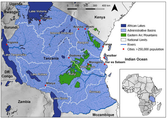 Our focus in this article is mainland Tanzania (885,800 km2), located along the Indian Ocean coastline, neighboured by Kenya to the north and Mozambique to the south. Mainland Tanzania’s western and southern borders cross through the African Great Lakes—Victoria, Tanganyika, and Nyasa. Several major river systems drain mainland Tanzania (Figure 1). The Pangani, Wami, Ruvu, Rufiji, and Ruvuma rivers flow eastward, descending from Eastern Arc Mountain blocks, winding through coastal forests, and eventually draining into the Indian Ocean. Much of the country’s human population, including urban centres like Dar es Salaam (6 million people) and Dodoma (2 million people), and major agricultural regions are located in these basins. Several other rivers such as the Malagarasi, Kagera, Ruhuhu and Mara flow towards the Tanzania Lake basins of Tanganyika, Victoria and Nyasa.