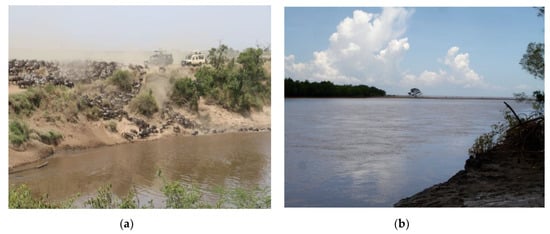 Most of Tanzania experiences a marked difference in precipitation between wet and dry seasons; river flows reflect this seasonality. Some rivers experience a bi-modal hydrograph, with peaks in flow that correspond to the long (masika) and short (vuli) rains; other rivers exhibit a uni-modal hydrograph [6,7]. Rivers are key ecosystem elements of several of Tanzania’s protected areas and critical to wildlife survival, particularly during dry seasons when other sources of water may dry out. For example, in the Serengeti National Park, the Mara River provides one of the only perennial sources of water for large wildlife and acts as a guidepost for wildebeests that cross the river multiple times during their annual migration (Figure 2a). Saadani National Park, located at the confluence of the Wami River with the Indian Ocean, protects the Wami’s estuary region, which also supports one of the most productive prawn fisheries along the East African coastline; intensive periods of prawn fishing coincide with high flows in the Wami River (Figure 2b) [8].