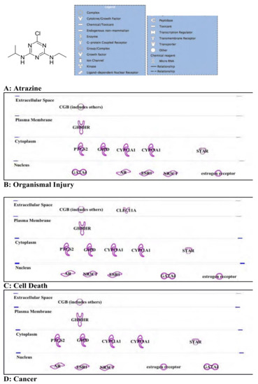 Atrazine. Panel A: Structure of atrazine and legend of symbols used for panels B to E (as provided by Ingenuity Pathway Analysis (IPA) modeling “Bioprofiler” function). Panel B–E: Cellular location and names of genes affected by atrazine exposure linked to, respectively, Panel B: Cellular response to organismal injury, Panel C: Cell death, Panel D: Cancer. Panel E: Behavior. Note that all symbols and genes names and functions are described in Supplementary Materials Tables S1–S4. The data were generated using human and animal model data. They include information from in vivo and in vitro experiments.