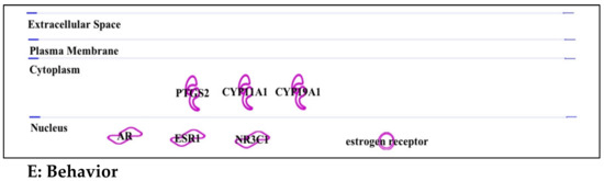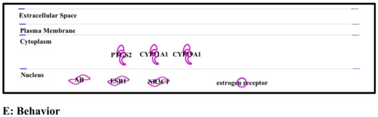 (D) Behavior: The main behavior-related genes identified in this ontological study were ESR1, NR3C1, and genes involved in the conversion of fatty acids or cholesterol to hormones. These include PTGS2, CYP11A1, and CYP19A1, which encodes aromatase (Figure 2E and Supplementary Materials Table S8). These findings suggest that chlorpyrifos exposure is closely associated with the production of sex steroids and the resultant signaling pathways, via the estrogen receptor-encoding genes ESR1 and NR3C1.