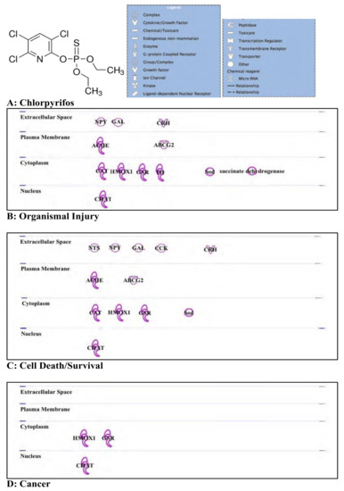 (B) Cell death/survival: The cell death- and survival-associated genes targeted by chlorpyrifos are similar to those involved in organismal injury (Figure 2C and Supplementary Materials Table S6). Examples include Sod, ChAT, ABCG2, CRH, NPY, and GA. In addition, a heme-oxygenase encoding gene known as HMOX1 is affected by chlorpyrifos exposure. Overall, the profile of cell death and organismal injury targeted by chlorpyrifos activity demonstrates that the toxicity of this chemical affects not only the existing cholinesterase enzyme, but also the genes which are key factors involved in cell protection and metabolism.