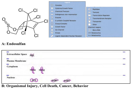Endosulfan. Panel A: Structure of endosulfan and legend of symbols used for panel B (as provided by IPA modeling “Bioprofiler” function). Panel B: Cellular location and names of genes affected by endosulfan exposure linked to cellular response to organismal injury, cell death, cancer, and behavior. Note that all symbols and genes names and functions are described in Supplementary Materials Table S9. The data were generated using human and animal model data. They include information from in vivo and in vitro experiments.