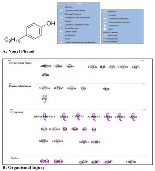 Nonyl phenol. Panel A: Structure of nonyl phenol and legend of symbols used for panels B to F (as provided by IPA modeling “Bioprofiler” function). Cellular location and names of genes affected by nonyl phenol exposure linked to, respectively, Panel B: Cellular response to organismal injury, Panel C: Cell death, Panel D: Organismal survival, Panel E: Cancer, and Panel F: Behavior. Note that all symbols and genes names and functions are described in Supplementary Materials Tables S10–S13. The data were generated using human and animal model data. They include information from in vivo and in vitro experiments.