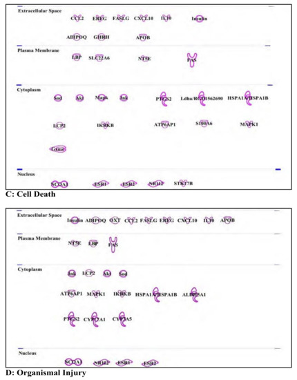(A) Cell death and organismal injury/survival: Exposure to NP has been reported to induce apoptosis in various cell types, including sexually related cells, neurons, and neural stem cells [98]. As NP acts as a hormone mimic, the effect on sexual organs was expected; however, the apoptotic induction in neurons and neuronal stem cells was more surprising. Nonetheless, the consequences of such exposure during gestation and/or early brain development may be a very serious issue that has not yet received full attention. These observed effects can be linked to hormone receptors mediated by the signal transduction triggered by several types of surface receptors such as the FAS receptor (also referred to as the “apoptosis antigen”) and the anion transporter SCL22A6 ([99] (see Figure 4B–D and Supplementary Materials Tables S10–S12).