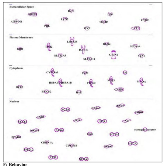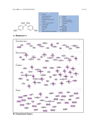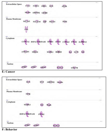 Bisphenol A. Panel A: Structure of bisphenol A (BPA) and legend of symbols used for panels B to F (as provided by IPA modeling “Bioprofiler” function). Cellular location and names of genes affected by bisphenol A exposure linked to, respectively, Panel B: Cellular response to organismal injury, Panel C: Cell death, Panel D: Organismal death, Panel E: Cancer, and Panel F: Behavior. Note that all symbols and genes names and functions are described in Supplementary Materials Tables S14–S18. The data were generated using human and animal model data. They include information from in vivo and in vitro experiments.
