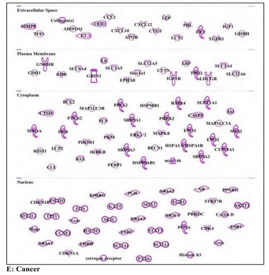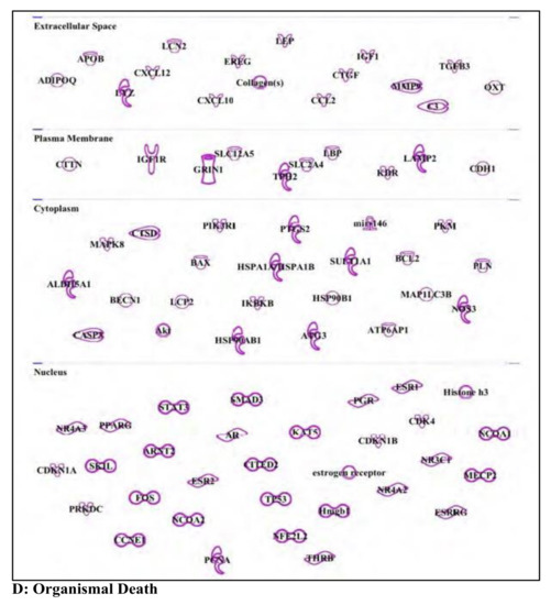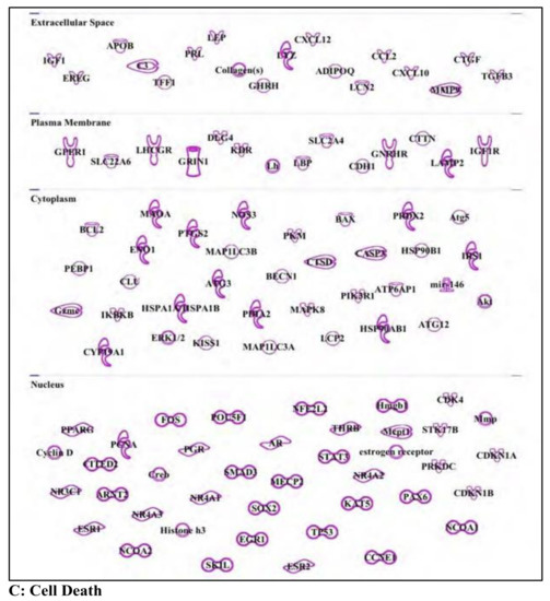Ingenuity Pathway Analysis (IPA®, Ingenuity Pathway Analysis, Qiagen Corp, Germantown, MD, USA): The identification of genes affected by the emerging contaminants was accomplished using the Ingenuity Pathway Analysis software. Information related to each individual emerging contaminant was entered into the software, resulting in a list of associated genes generated by the Ingenuity Pathways Knowledge Base. The cellular network and localization of these genes were then algorithmically elucidated using the IPA® mapping tools, allowing for the visualization of the various interactive disease and functions nodes affected by each individual emerging contaminant. Matching tables were compiled using the “BioProfiler” function of the IPA® mapping tool, and the display of our analysis was focused on the gene’s symbols, synonyms(s), NCBI Entrez gene names, cellular location, and nature/function (shown as “Family” in the tables). All of the compounds were analyzed for their roles, links, and functions related to the following IPA® selection “Families”: Organismal injury, cell death, organismal survival, cancer, and behavior (which were the top five functions outlined using the default ontologic/metabolomic analytical “BioProfiler” as a basis for our specific analysis settings). The tables and figures presented are based on our analysis and display all of the data generated by the above-mentioned algorithm. The absence of data for any specific “Family” indicates a lack of IPA-available information about the particular compound analyzed. All data were obtained without statistical bias or any favorable weight assigned. For each “Family”, the tables were compiled to present all the genes affected by a specific compound (see below for a more detailed algorithm and Tables in Supplementary Data).