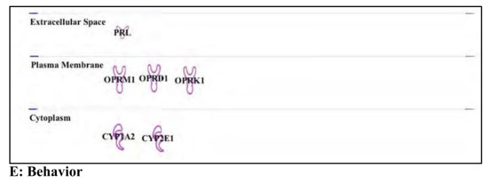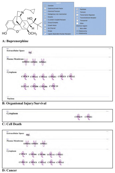 Buprenorphine. Panel A: Structure of buprenorphine and legend of symbols used for panels B to E (as provided by IPA modeling “Bioprofiler” function). Cellular location and names of genes affected by buprenorphine exposure linked to, respectively, Panel B: Cellular response to organismal injury and survival, Panel C: Cell death, Panel D: Cancer, and Panel E: Behavior. Note that all symbols and genes names and functions are described in Supplementary Materials Tables S19–S23. The data were generated using human and animal model data. They include information from in vivo and in vitro experiments.