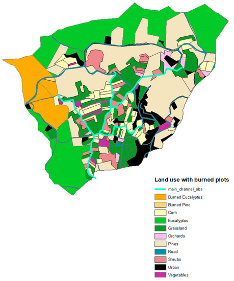 Burnt area scenarios were calculated from climate scenarios according to Sousa et al. (2015) [21]. To this end, the annual burnt area in the region surrounding Macieira (the Águeda river basin) between 1990–2016 was calculated from Portuguese historical databases [13], and a multiple linear regression was calculated with monthly rainfall anomalies, extreme fire weather (days with daily severity rating (DSR) above the 90th percentile [52]) and fire history in the preceding years. Meteorological data was taken from the ECMWF Re-Analysis [53]. While the agreement with observations was not very high (r2 = 0.50), it was sufficient to provide a “best guess” of how much and when the burned area would change for the climate scenarios. Burnt area scenarios under climate change were calculated using rainfall and DSR projections, the latter with a correction for bias using an empirical quantile mapping approach [54]. The estimated doubling of burnt area, reflecting an increase in fire frequency rather than the size of the burnt areas, was more conservative than the three- to four-fold increase obtained with the same methodology for northwestern Iberia [21]. The results for the Águeda were subsequently downscaled for Macieira watershed, by assuming a doubling of fire frequency, from 1× to 2× every 20 years. Fire location was that of the 2011 fire, while the burnt area was the same in all scenarios, except for S2 with 5% larger burn area due to the eucalypt stand in the southern part of the catchment (Figure 2).