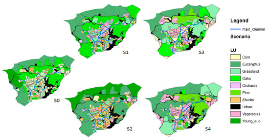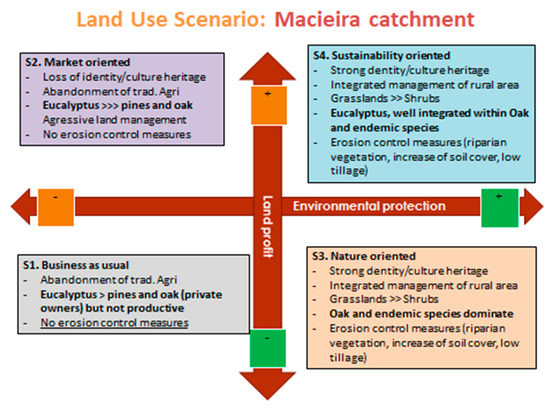 The current situation (S0) in Macieira is described as that of traditional agriculture (including corn and grassland) that has gradually been abandoned for afforestation, especially with Eucalyptus plantations that now occupy both abandoned agricultural areas and large areas of former pine forest and shrubland (Figure 4). Orchards, although still marginal, are increasing in all our scenarios as being a new profitable production system (berries). In all the scenarios, pine plantation decreases due to low profitability and due to reported increased pests and diseases, while oak is re-introduced in the environmental protection scenario (S3) and the sustainable scenario (S4) for biodiversity conservation and increase in soil water holding capacity, with incentives from local associations and/or government. In the S3 scenario, the maintenance and/or restoration of riparian vegetation is foreseen to capture sediments along the stream (with vegetated strips), in combination with adoption of conservation agriculture with lower tillage intensity. In S4, the same biodiversity and soil protection measures were implemented as in S3 but to only half the extent. In S3 and S4, soil tillage was also adjusted to follow contour lines.