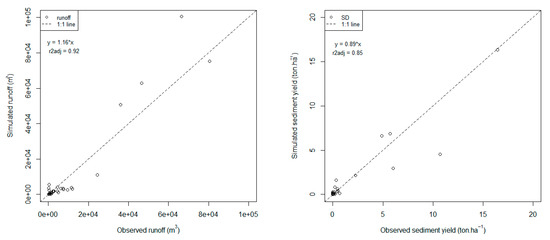 Results of calibration of LandSoil model for runoff (left plot) and sediment yield (right plot) with observed events between 2010 and 2013. SD stands for sediment yield.