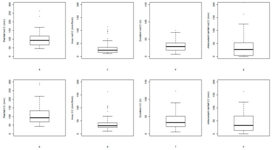 Boxplots of key characteristics of major rainfall events under present (no climate change—noCC, 1986–2005) and future (climate change—CC, 2041–2060) climate conditions: rainfall total (a,b), maximum intensity over 5 min (c,d), duration (e,f) and antecedent 48 h rainfall (g,h).