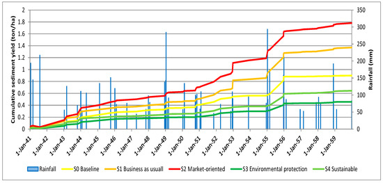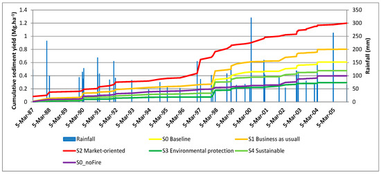 Cumulative sediment yield (SY) in Mg ha−1 vs. rainfall in mm under climate change between 2041 and 2060 with two fire occurrences in 1941 and 1951.