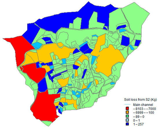 Concerning sediment reduction caused by mulching, Shakesby et al. (1996) [63], showed that Eucalyptus logging litter reduced soil erosion by 95%. The average reduction was five times in Prats et al. (2019, 2012); it should be noted that, in the latter study, maximum erosion rates were lower than in our study site. As previously said, the study site of Prats et al. (2012) also presents smaller temporal and spatial scales. In our study, mulch could reduce SY by up to 40%, which was quite high considering that fire only impacted roughly 10% of the watershed. We also suggest that these values vary with the type and quantity of mulch that is applied, the soil type, the percentage of soil cover and the slope of the site (Prats et al., 2014, 2012). Finally, Figure 5 and Figure 6 show that erosion was mainly a raindrop-driven process with the detachment of sediments in eucalypt forest and some tilled field. The highest levels of soil loss occurred in the burnt field area and in one field with a slope above 10° in the S2 scenario (about 7–8 Mg per parcel) and these three areas contribute to 37% of total soil loss in scenario S2 (Figure 7 and Figure 8). The combined impact of fire on SY at the outlet and the spatial representation of soil loss coming from burned areas show that erosion was mainly due to soil detachment rather than transported by water to the outlet via sedimentation on the riparian field close to the stream and in the terraces.