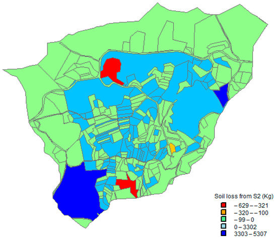 Soil loss between 1986 and 2005 in S2 after two fires (Kg). Negative values represent soil loss and positive values represent gain.